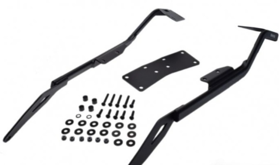 W zestawie znajdują się elementy montażowe, które pozwalają zamontować stelaż na motocyklu.